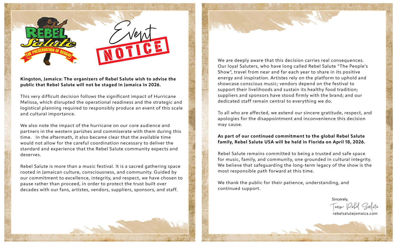 Rebel Salute 2025 will be one night only on January 17, 2026. 1. Comfortable shoes to endure standing for long hours (overnight) all night…